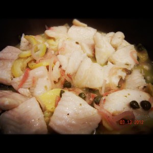 Into a non-stick pan, heat 1 teaspoon of olive oil. Saute the ginger and shallots until fragrant. Add the fish, some salt and pepper, the capers and the sliced lemon. Cook for 2-3 minutes on medium high heat. Add in the lemon juice and drizzle with some more olive oil. Cover the pan and cook for another minute.