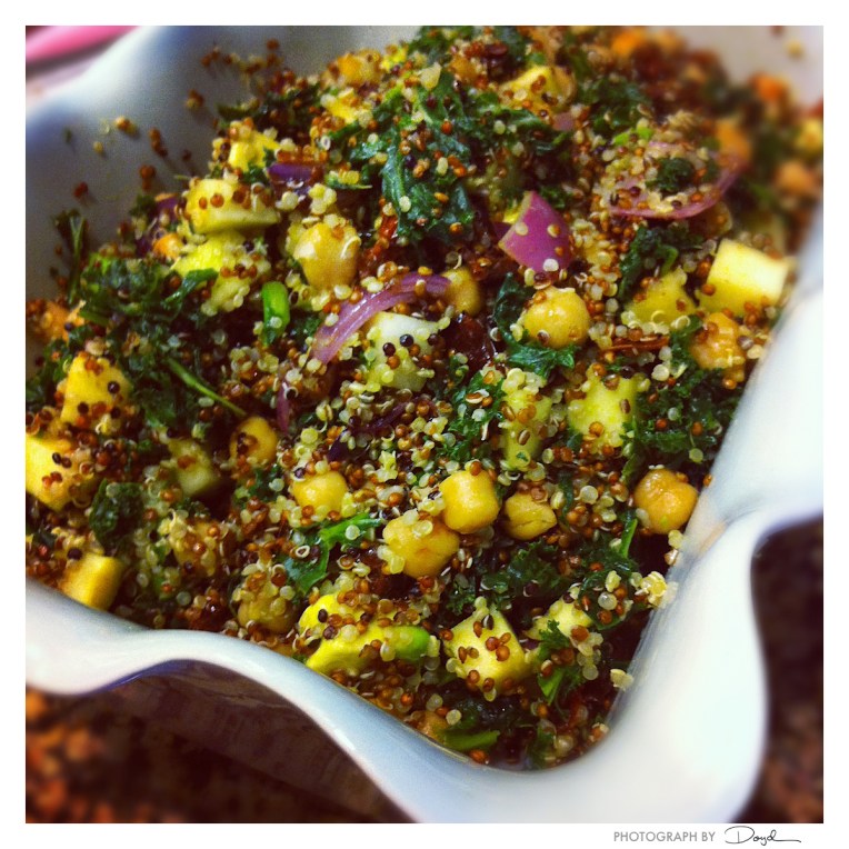 Together with the Kale in a bowl, mix the sautéed ingredients with the quinoa plus add the diced apple, avocado and lemon juice then mix well. Serve as is or top with some fried tofu, grilled fish or fried eggs.